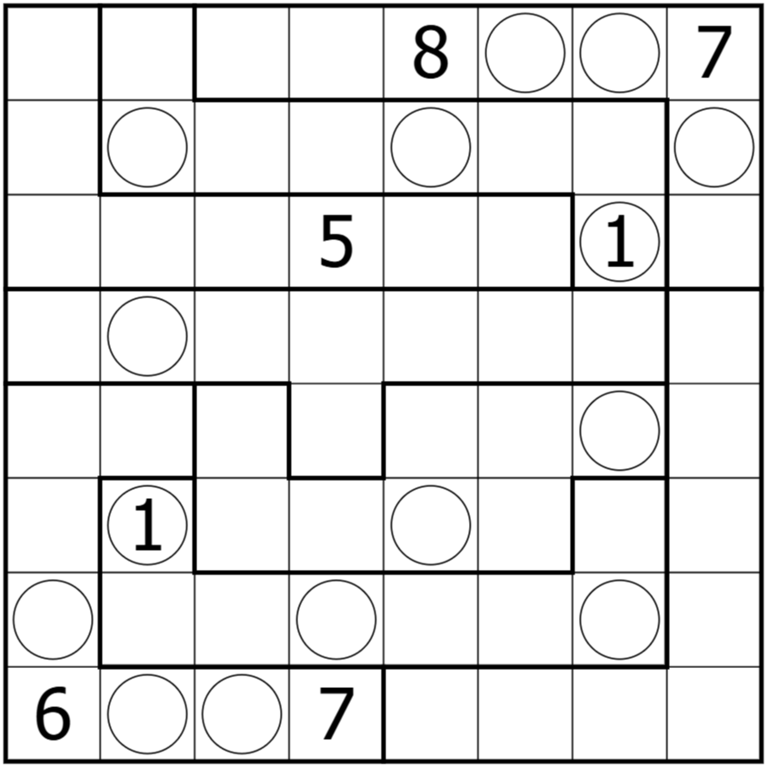 • Chaos Destruction: All given regions must be "destroyed" by making sure they do not contain all the digits 1-8. The grid also consists of eight hidden, orthogonally connected regions that each do contain all the digits 1-8. Digits in circles represent how many of its orthogonally and diagonally adjacent cells, including itself, belong to both the given and hidden regions where the circle resides (i.e., where they overlap).