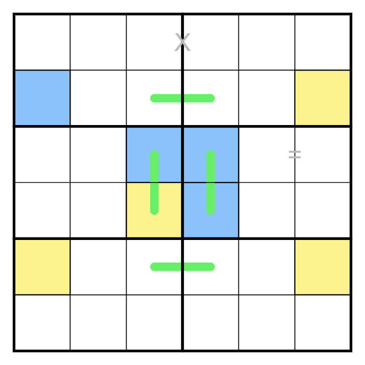 Tango: Color the cells of the Sudoku grid in a way that: