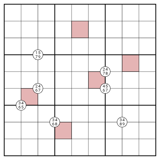 Circles are placed between cells of which two cannot belong to the same block (all circles are given). Every digit in a circle has to be assigned to a surrounding cell.