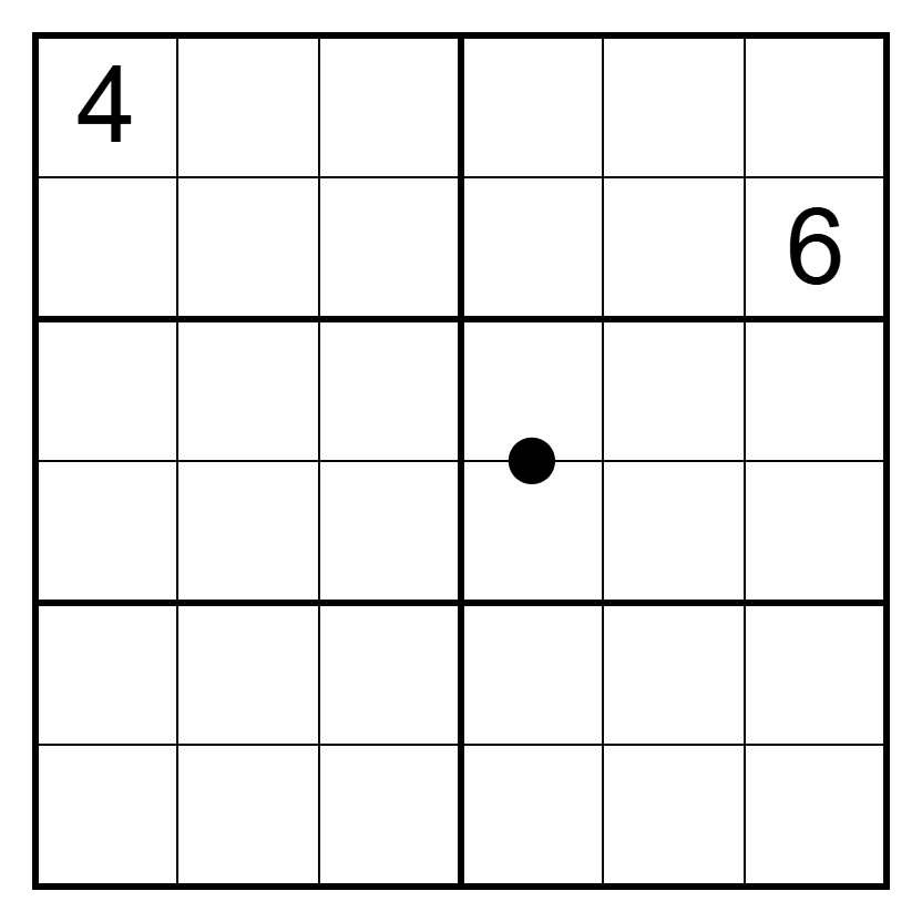 Kropki Dots: Digits separated by a black dot have a 1:2 ratio, meaning one is exactly double the other. Not all dots are necessarily given.