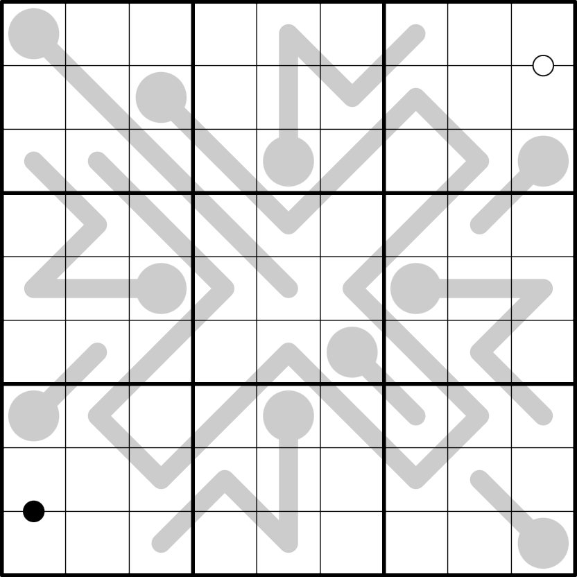 - Digits separated by a black Kropki dot are in a 2:1 ratio.