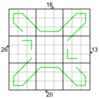 Little Killer Sums: a clue with an arrow outside the grid gives the sum of the digits along the diagonal indicated by the arrow.