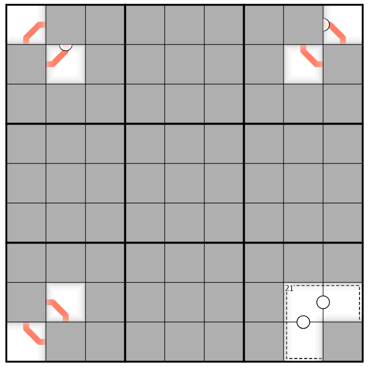 olima: The average of the digits 1 to 9 is 5, so digits on a dark orange line must be odd or high - or both.