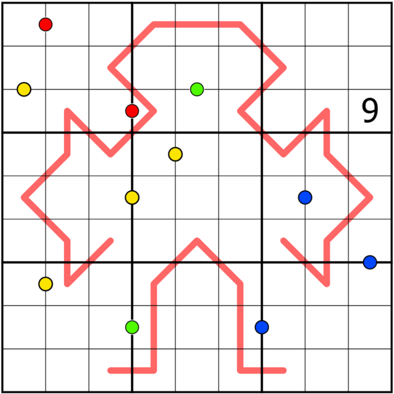 - Parity Line: Adjacent cells along a red parity line must contain one odd and one even digit
