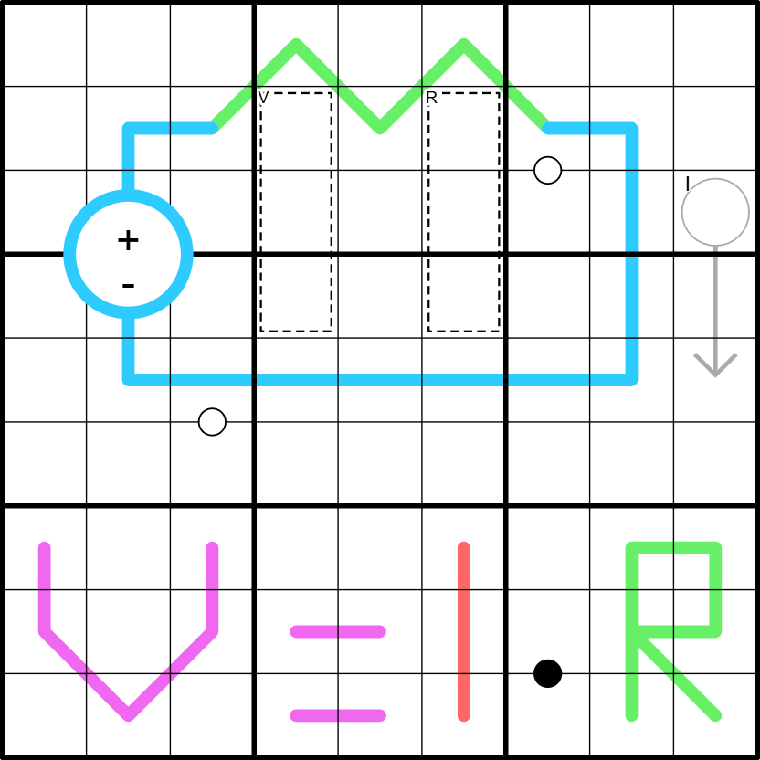 Ohm's Law: The grid contains an electric circuit with a power supply of V Volts and a resistor of R Ohms. Hence, a current of I Amperes is flowing through the circuit, where I = V/R. These values must be determined by the solver using the following information: - The cage labeled V contains the 3-digit number V, reading from top to bottom. - The cage labeled R contains digits that sum to R. This sum is also equal to the region sums of the region sum line. - The arrow's circle contains the current I.