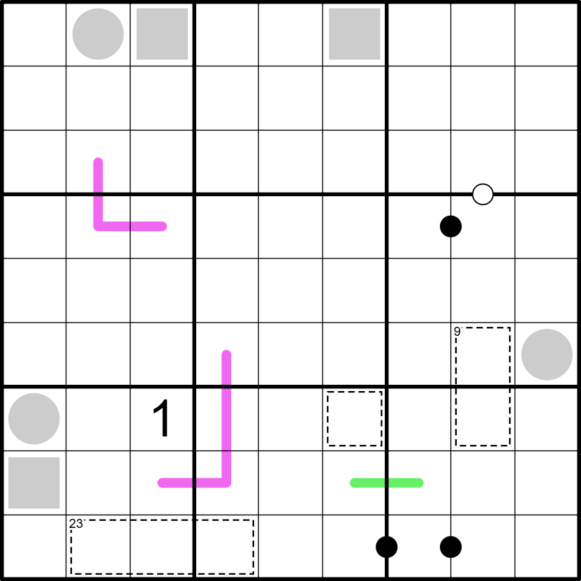 Hidden Mirrors: There are 4 9-cell long mirrors hidden in the grid, each dividing it into 2 halves of equal size and shape. Mirrors are straight and can only intersect with each other at a single point; they cannot partially or entirely overlap. Digits cannot repeat along the mirrors. Each mirror acts on different types of clues, i.e, they generate reflections of the given clues according to the following rules: