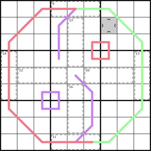 Normal Sudoku rules apply. GERMAN WHISPERS- Numbers on green lines are at least 5 apart from their neighbors on the line. DUTCH WHISPERS- Numbers on red lines are at least 4 apart from their neighbors on the line. RENBAN- Numbers on purple lines are each a set of non-repeating, consecutive numbers, in any order. KILLER CAGES- Numbers in cages sum to the number in the top left corner of the cage. MINIMUM- The number in the gray square is less than all of its orthogonal neighbors.