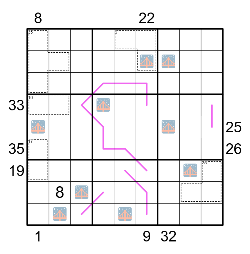 • Values in a cage sum to the indicated total. Digits and values may repeat within a cage.