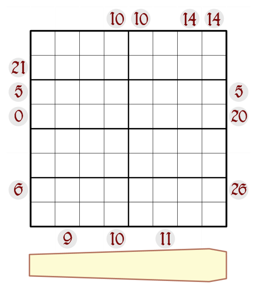 - A clue outside the Row or Column N indicates the sum of all values up to the first cell seen from the clue that contains the value N. (The value N itself is not included in the sum.)