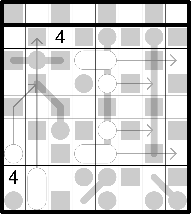 Digits along a thermometer must strictly increase away from the bulb (no repeats). Digits on an arrow sum to the connected circle. No digit anywhere on the arrow or in the sum may repeat. If a sum is multiple digits, the tens place will be on top or to the left. Digits in a grey square are even. Digits in a grey circle are odd. For clarity, no grey circles are on a thermometer.