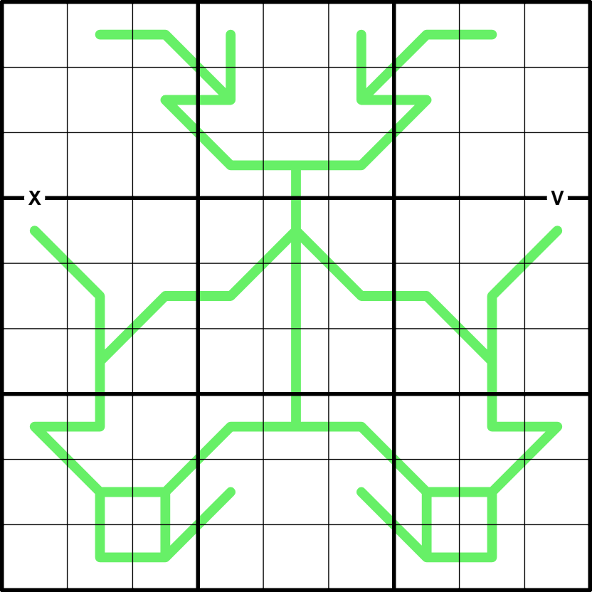 X/V: Digits in cells joined by an X sum to 10. Digits in cells joined by a V sum to 5. Not all Xs and Vs are given.