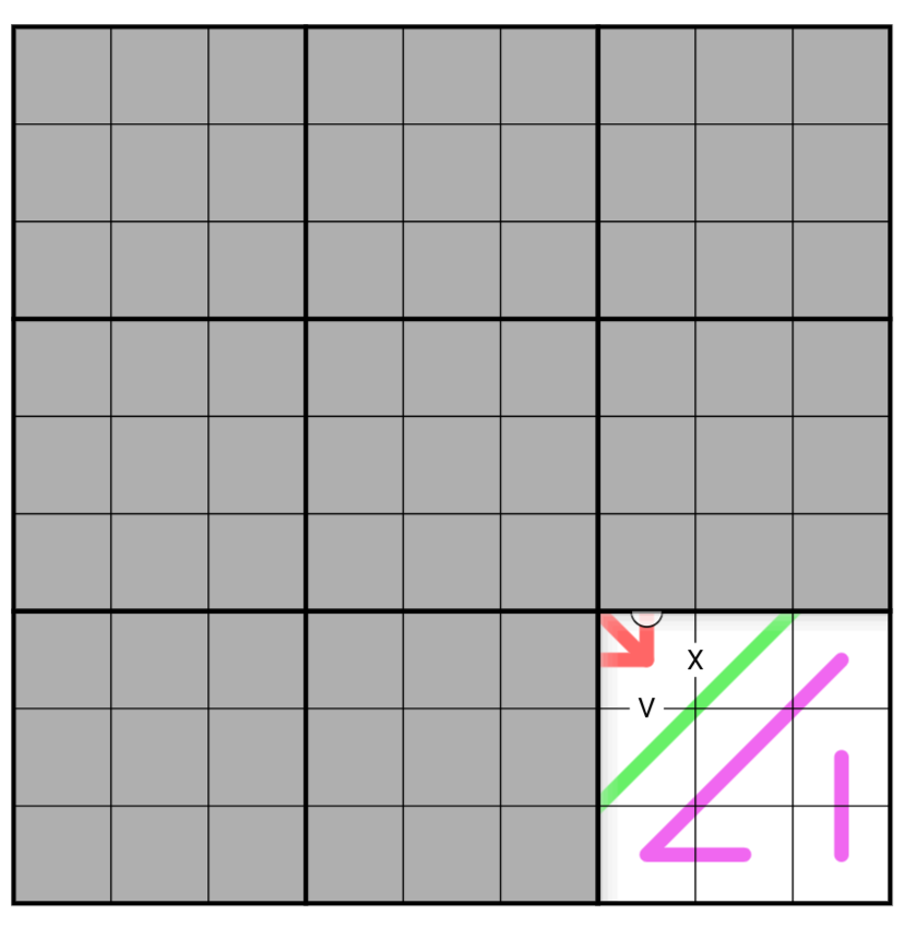 • Digits along a blue line create a sumline where the sum of digits on a line within a particular 3x3 box must be the same for all the boxes the line passes through.