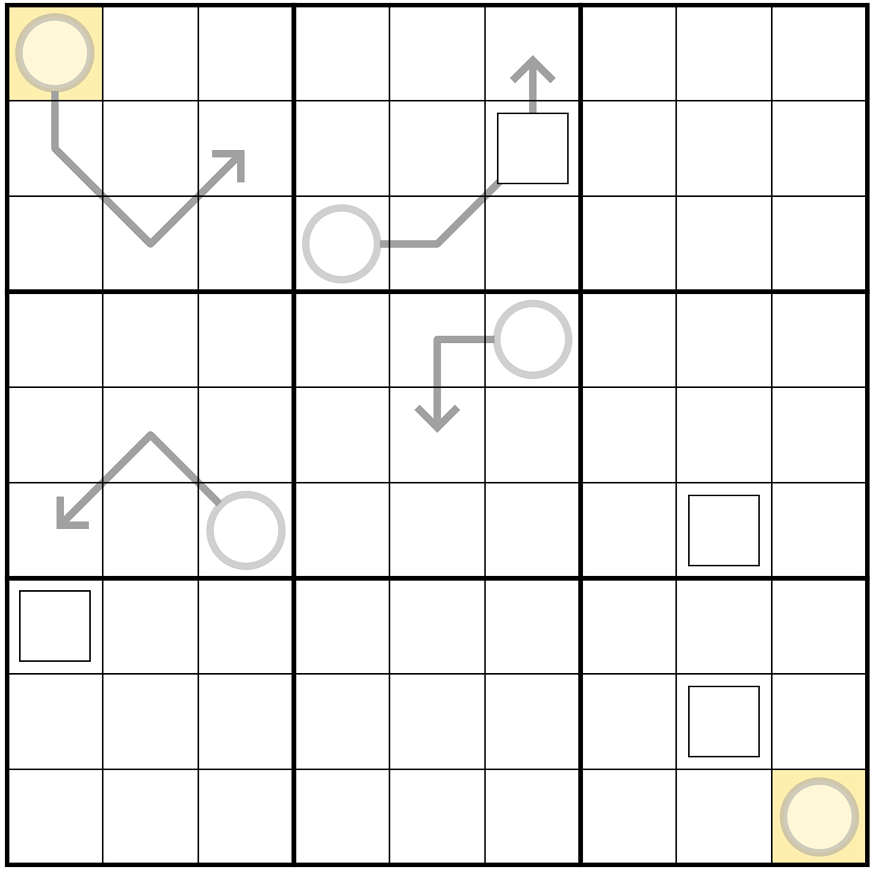 Journey: Starting at the highlighted cell in the top left and ending in the highlighted cell in the bottom right, draw a line which moves only orthogonally and does not touch itself, not even diagonally. (For the avoidance of doubt, this means that if any two cells in any 2x2 box are both visited on the journey, the section of journey which connects them cannot leave that box in between visiting those two cells.)