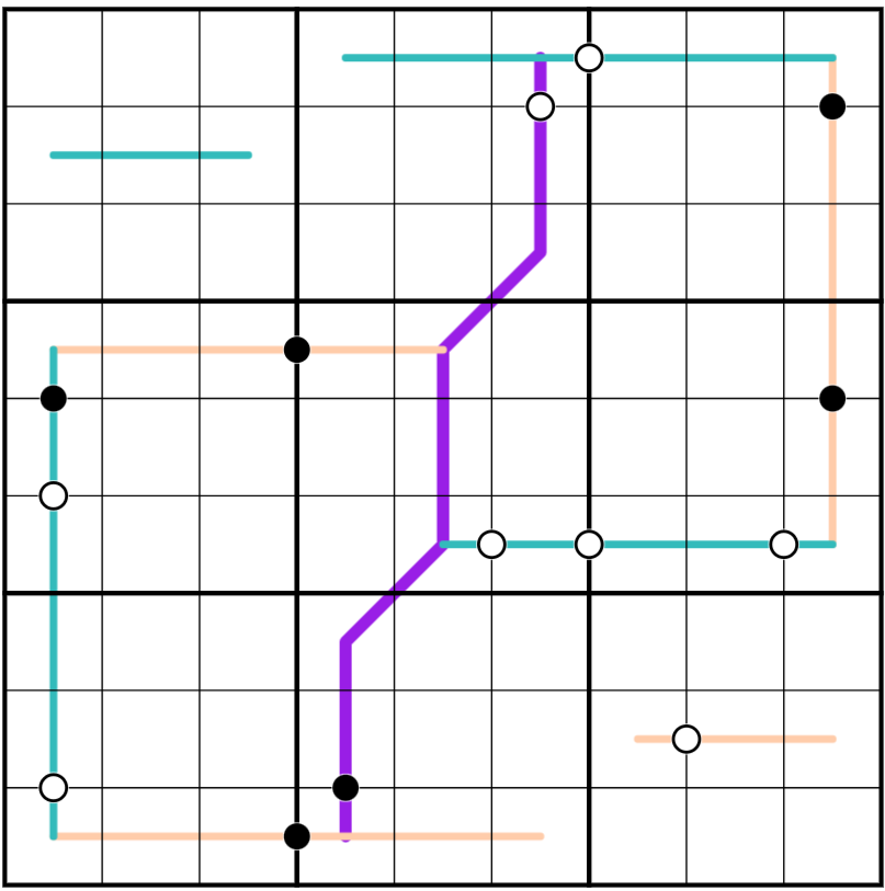 Beaded thread constraint: All kropki dots that fall directly on a line are given, and no kropki dots that are partially or fully off the lines are given (though they may exist).