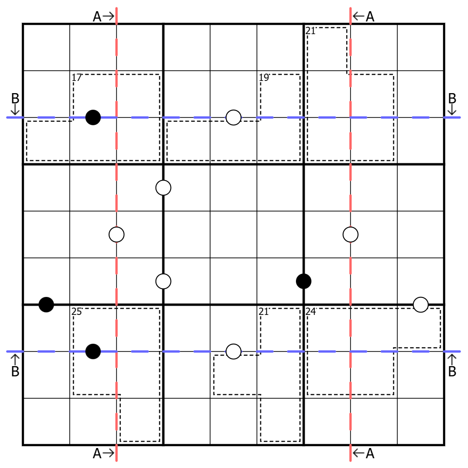 Mad Fold-in: The dashed red lines can be folded onto each other such that columns 1, 2, 8 and 9 form a 4x9 grid. Similarly, the dashed blue lines can be folded onto each other such that rows 1, 2, 8 and 9 form a 9x4 grid. The blue and red lines can also be simultaneously folded onto their respective partner lines to form a 4x4 grid. In each of these instances, all clues within the grid must still be valid.