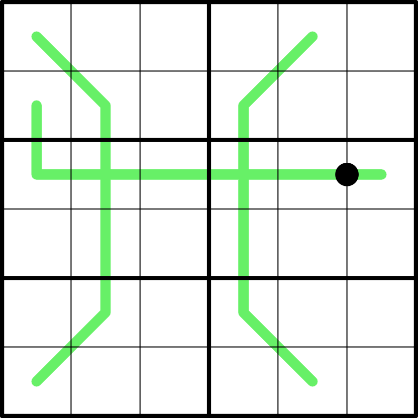 German Whispers Lines: Green lines in the grid are German Whispers lines. Adjacent digits along the line must have a difference of at least 3.