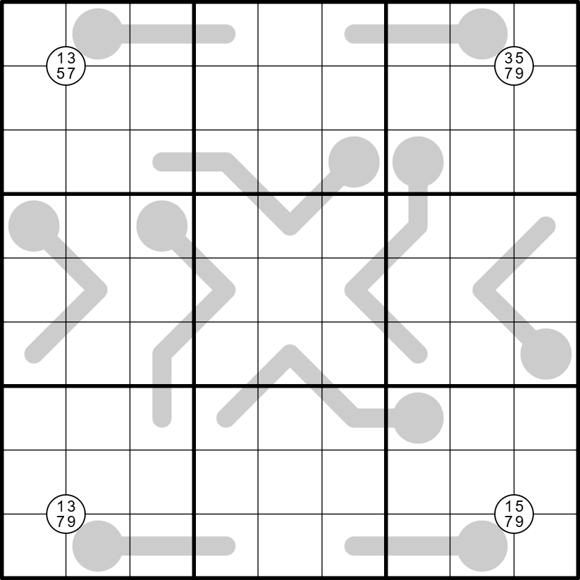 Quadruples: There are circles in the grid which occupy the corners between some cells called quadruples. Digits in the circles must all appear at least once in the cells touching them.