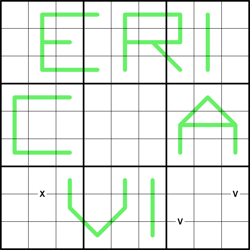 X/V: Digits in cells joined by an X sum to 10. Digits in cells joined by a V sum to 5. Not all Xs and Vs are given.
