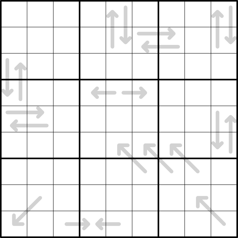 The two digits on an arrow give the coordinates of a particular target cell somewhere in the grid. The digit on the arrow's shaft indicates the target cell's row, and the digit on the arrowhead indicates the target cell's column. The sum of the two digits should be placed into the target cell. No two arrows target the same cell.