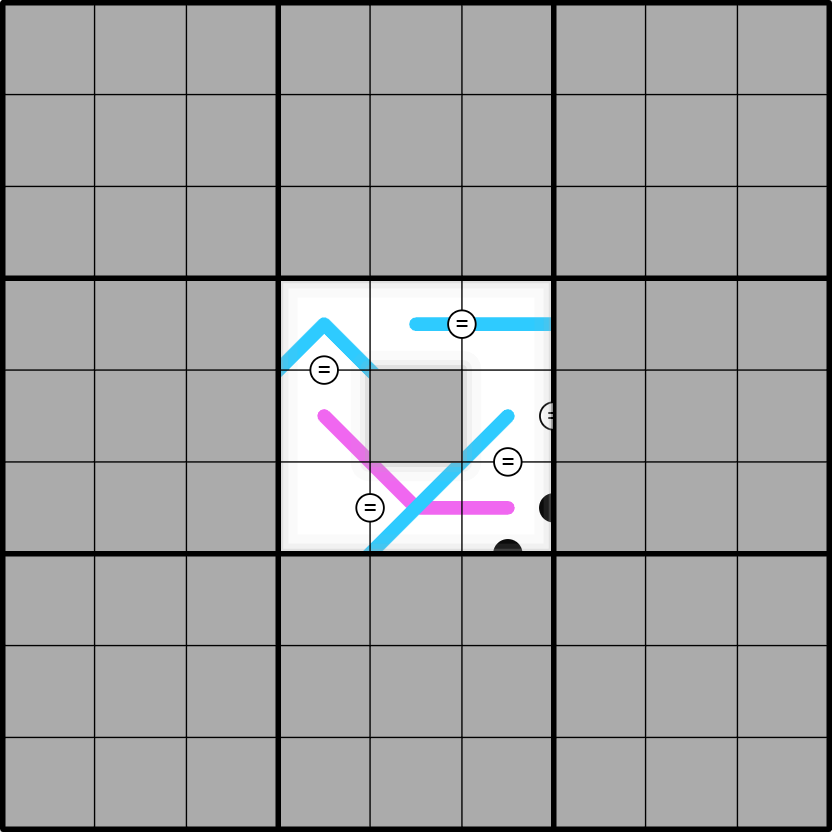 Kropki dots: Cells connected by a white dot with equal sign have equal values. Cells connected by a black dot have values, one of which is double the other. Not all dots are necessarily given.