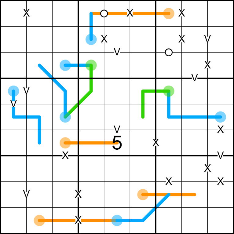 Tough but fair "middle"* and a very enjoyable puzzle overall. The twist on the connected x-lines makes you think quite differently about them.