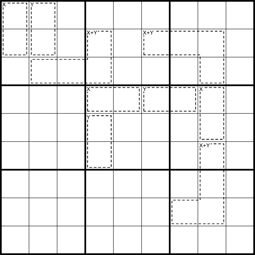 • Cells in a cage are either all shaded or all unshaded and their digits sum to the value in the upper left corner of the cage, where X and Y have to be determined.