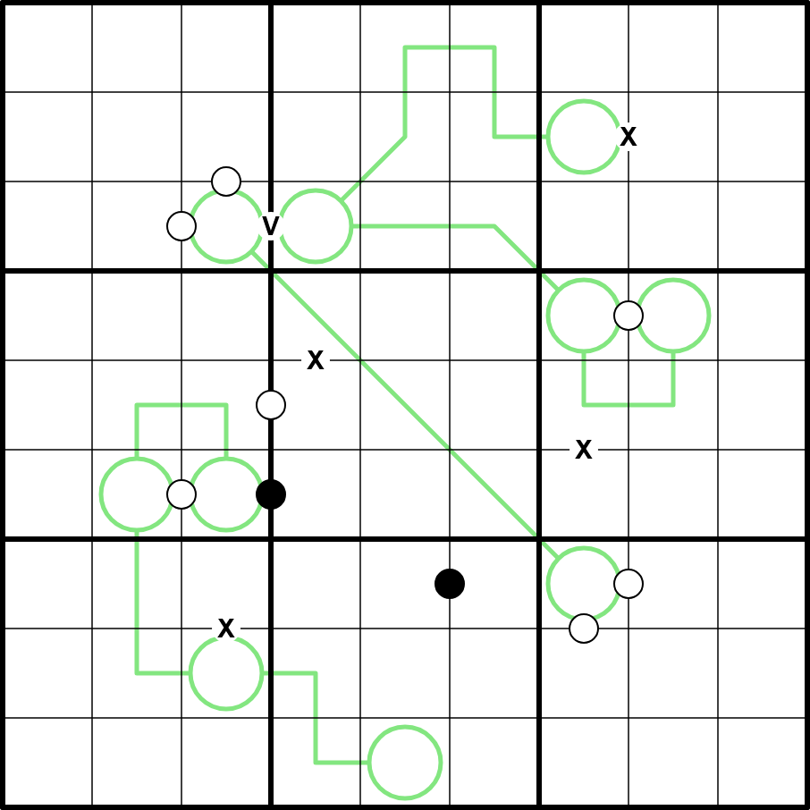 - Kropki - digits separated by a white Kropki dot differ in value by 1; digits separated by a black Kropki dot have a value ratio of 2:1. No negative constraint.