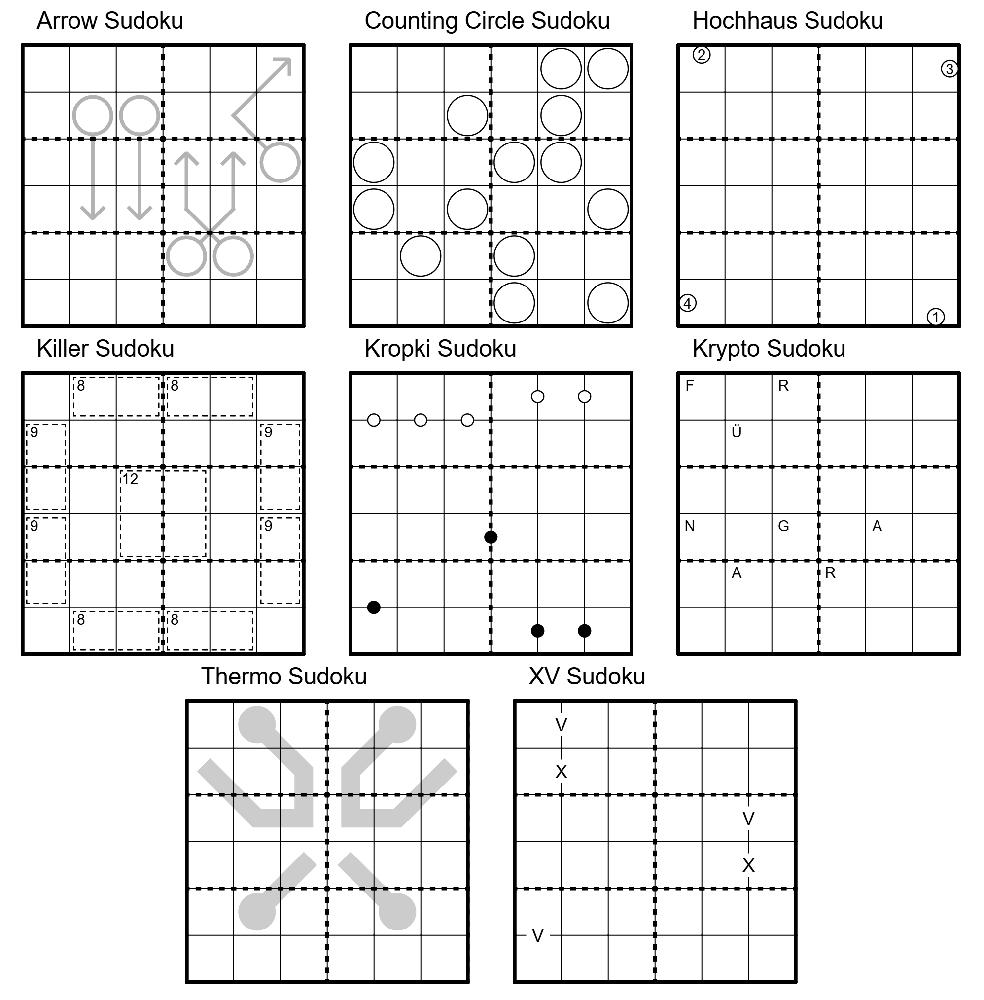 This year Santa Claus commissioned his entire gnome team to create a Sudoku for Grana. Much to his displeasure, the quarreling gnomes misunderstood the task and each individual created a separate 6x6 Sudoku: an Arrow Sudoku, a Counting Circle Sudoku (if a circle contains a digit N, then exactly N circles contain this digit), a Skyscraper Sudoku, a Killer Sudoku, a Kropki Sudoku (without negative constraint), a Cipher Sudoku (same letters stand for same digits, different letters for different digits), a Thermo Sudoku, and an XV Sudoku (without negative constraint). And even worse - none of the eight Sudokus were uniquely solvable, some were even unsolvable.