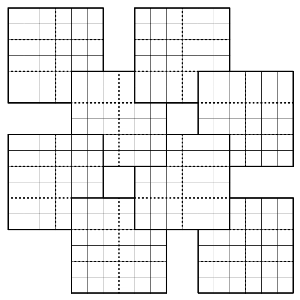 Without further ado, Santa grabbed the eight puzzles and made a collage, in which puzzles overlap each other by 2x2 areas at the corners. Digits located on the overlaps now count for both puzzles. The overlaps also affect the clues - for each puzzle, only the clues and parts of clues that are still visible count. Everything under the overlaps can be different than in the original puzzle: For example, killer cages that are partially covered by an overlap can contain different cells under the overlap, as long as the visible border of the cage still makes sense. Similarly, Arrows or Thermos that are partially covered may extend freely under the cover as long as the visible part (including the transition into the overlap) is valid. When a killer cage's total is covered, the cage can have any total. Kropki circles that are completely under an overlap are no longer necessarily valid, but those that are only half covered are still valid. Counting Circles can be removed or added as desired under an overlap.