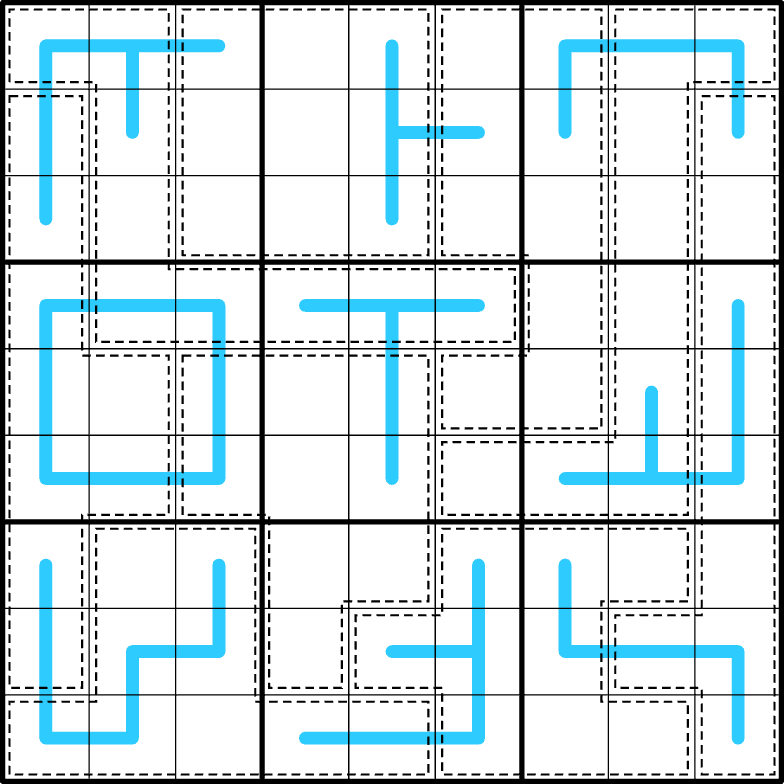 Cage borders divide blue Cage Sum Lines into segments with equal sums.