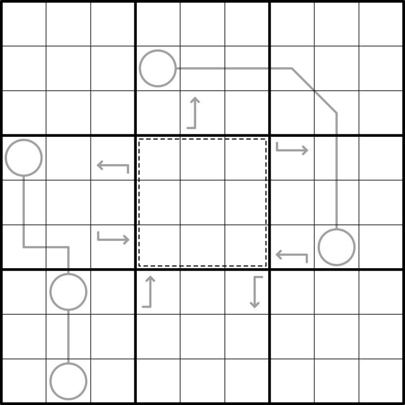 Double arrows: The sum of the digits along a grey line is equal to the sum of the digits in the circles at either end of the line.