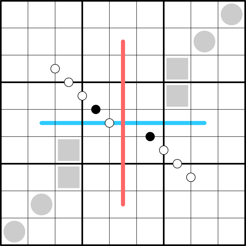 • A cyan or red Sum line must have sections with digits that sum to the same value, with sections divided by the 3x3 boxes.