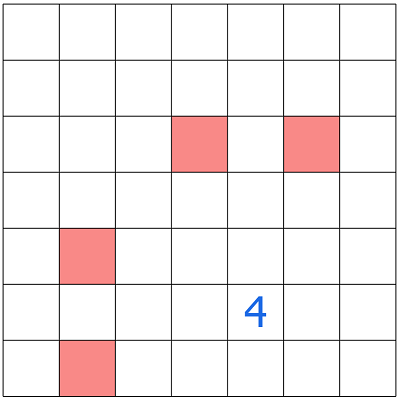 Example of a camel move: The cells shown in red cannot contain the digit 4 in R6C5, as they are a camel’s move apart. This is similar to a knight’s move, but extended by one additional cell.