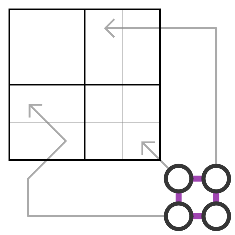 For example, say the connected-circles square is 1234 in normal reading order. So, 1 is next to 2 and 3, but not 4. Then, in the main grid, if R1C1 is 1, then R1C2 must be 2 or 3, and can't be 4 (similarly, R2C1 must also be 2 or 3, and also can't be 4).