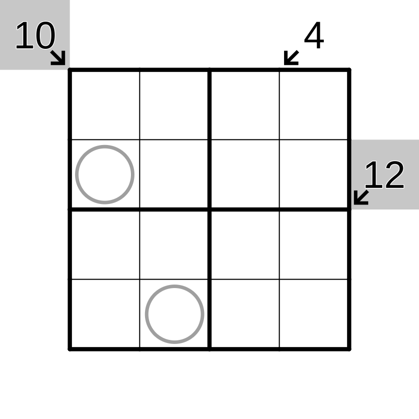 A 4x4 example with the same rules (left) and its solution (right). The path of the 12 clue teleports twice before arriving at the circled 2.