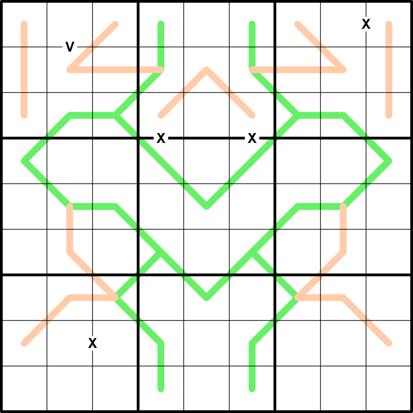 X/V: Digits in cells joined by an X sum to 10. Digits in cells joined by a V sum to 5. Not all Xs and Vs are given.