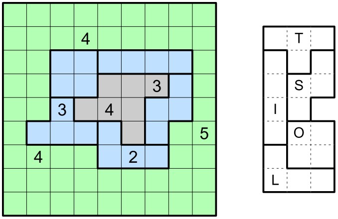 The pentomino ring divides the grid into three different regions made of orthogonally connected cells: the ring region, the central region and the outer region.