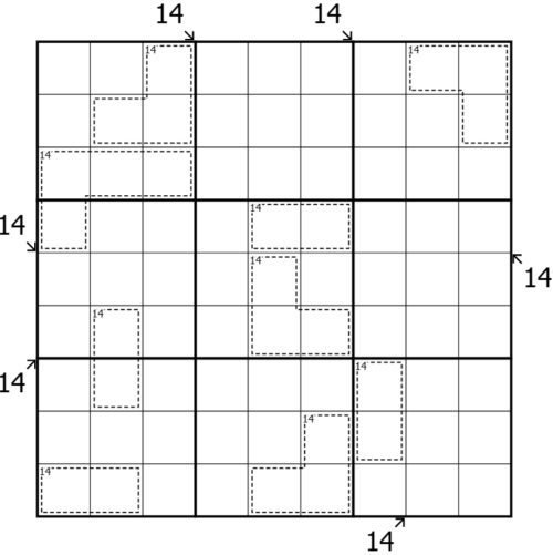 Clues outside the grid, indicated by arrows, show the sum of the digits along the diagonal path of the arrow.