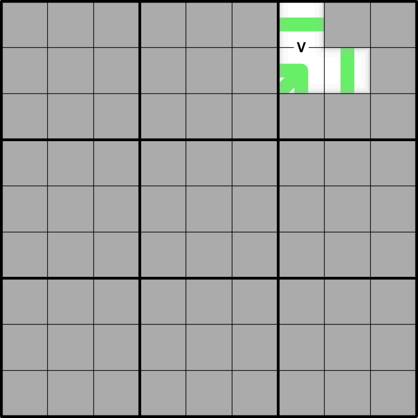 V: Digits in cells joined by a V sum to 5. Not all Vs are given.