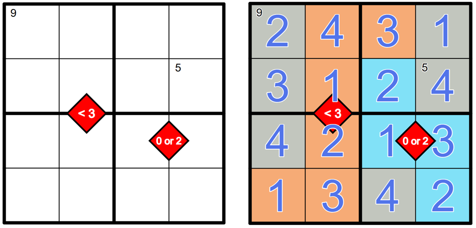Rotational Difference: Within a galaxy, cells rotated 180° from each other must differ in value by the digit (or digits) shown in their red diamond.