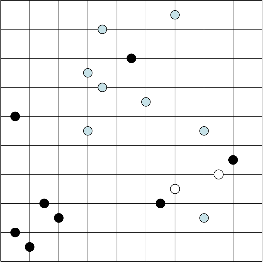 Q: "in the same way" = cells on b/w dots only can see orthogonally, I suppose?