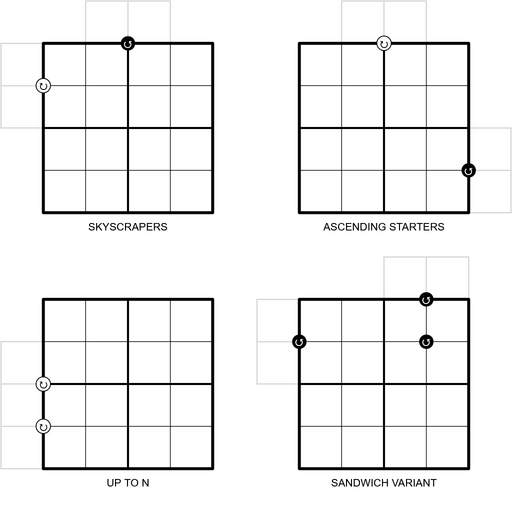 Puzzle Link: Skyscrapers | Ascending Starters | Up to N | Sandwich Variant