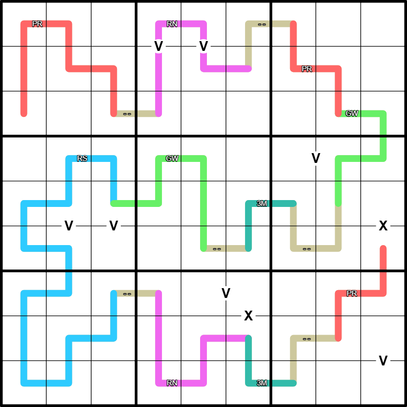 Cells connected by a pink Renban [RN] sub-line form a set of consecutive digits, in any order, without repeats.
