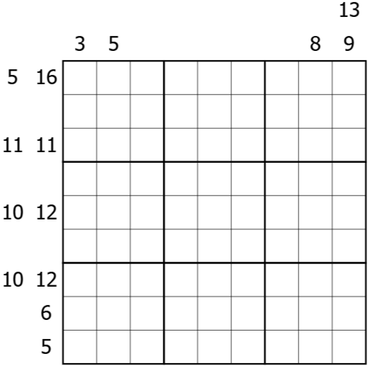 Clues outside the grid indicate a sandwich where the two crust digits sum to the clue and so do the sandwiched digits. Two sandwiches in the same row or column appear in the same order as the clues and they do not overlap, not even by a single digit.