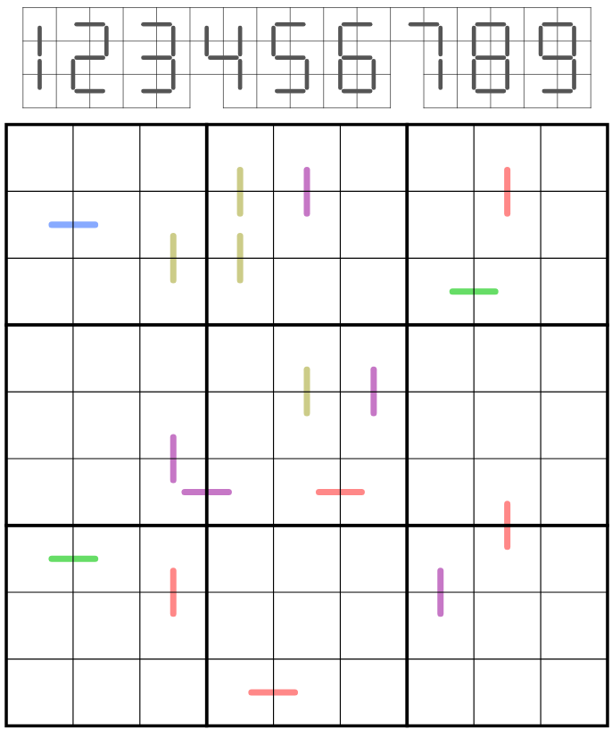 At least one cell within each BIGIT contains the number shown by the BIGIT. Each BIGIT consists of a single line colour. Each BIGIT contains at least one given line segment and each given line segment is part of a BIGIT.