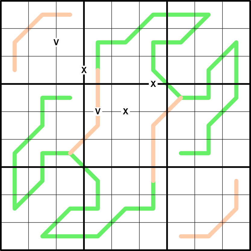 X/V: Digits in cells joined by an X sum to 10. Digits in cells joined by a V sum to 5. Not all Xs and Vs are given.
