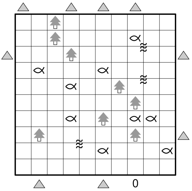 Some cells must be filled with tents, so that each tree is standing next to a tent vertically or horizontally. The tents may not touch one another, not even diagonally. The digits along the edge indicate how many tents are in the respective column or row.