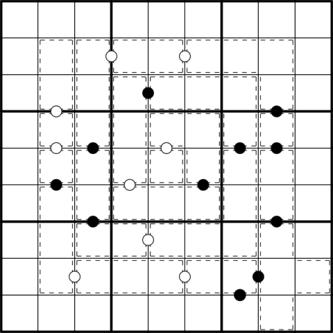 Kropki: White dots connect consecutive cells, black dots connect cells in a ratio of 1:2. Not all dots are given.