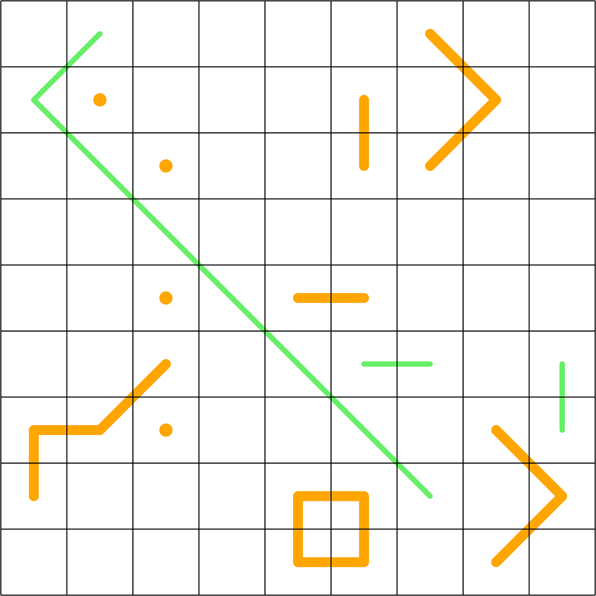 Dutch Windmills: Orange dots are windmills. They are seeing cells, but there is no other seeing cell in the eight surrounding cells which differs by 4 or more (and therefore which could be connected to it with a whisper).