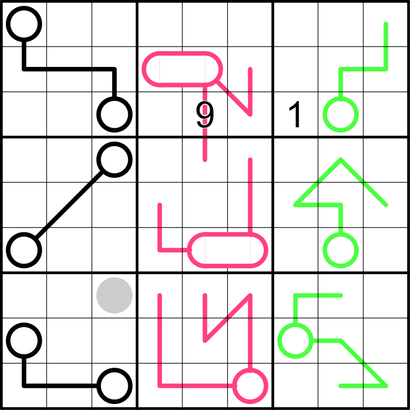 Green Lines: The digit in the circle is N. Two cells connected by the line must have a difference of at least N (The digit in the circle is also part of this line).